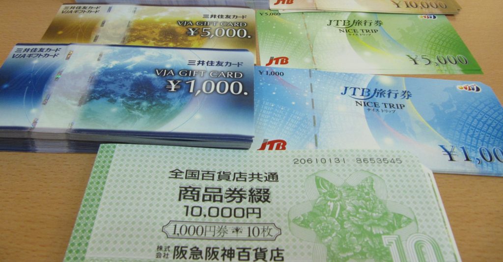 JCBギフトカードなどの金券、全国百貨店・スーパーの商品券、JTBナイストリップなどの旅行券、JAL・ANAなどの株主優待券、クオカード・図書カード・テレホンカードなどを幅広く高価買取しています。