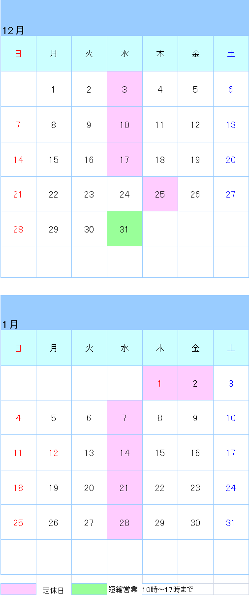 12月31日(水) 短縮営業 午前10時~午後5時まで